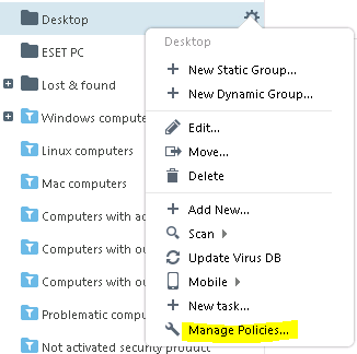 Policies werden im ERA unter Admin > Policies definiert. Dort können sie auch den Gruppen zugeteilt werden. Bestehende Policies können alternativ auch über die Eigenschaften der Gruppen zugeteilt werden.