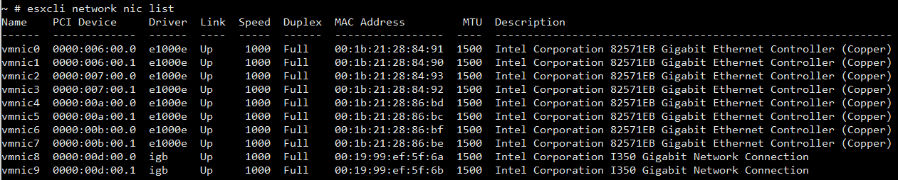 ~ # vmkchdev -l | grep vmnic9 0000:0d:00.1 8086:1521 1734:11ce vmkernel vmnic9