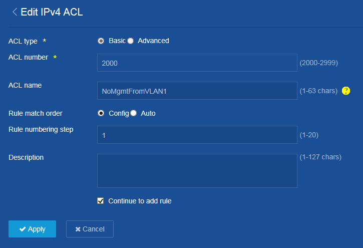 Mit „add ACL“ wird eine neue Liste erstellt (Edit IPv4 ACL). Diese erhält eine Nummer und einen aussagekräftigen Namen. Im Beispiel: „NoMgmtFromVLAN1“. Man sollte an dieser Stelle den Haken bei „Continue to add rule“ setzen, um im Anschluss direkt zur Definition der ersten Regel zu gelangen.