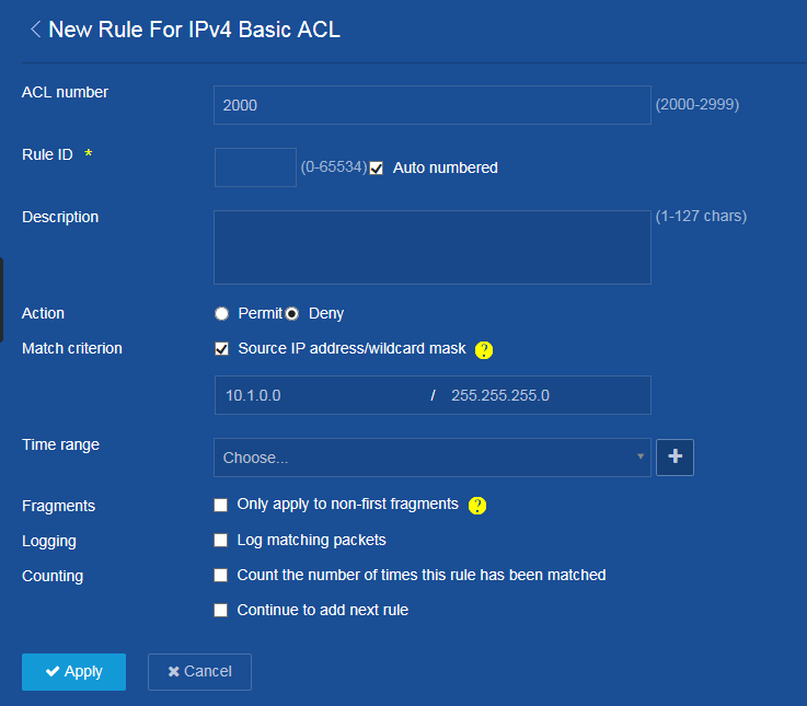 Wir erstellen hier exemplarisch eine „Deny“ Regel, die den Zugriff aus dem Subnetz 10.1.0.0 verbietet.