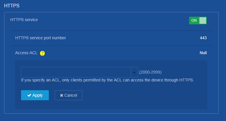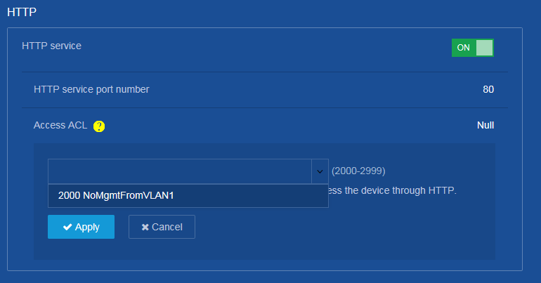Der HTTP Dienst ist aktiv und es ist noch keine ACL an ihn gebunden (Null). Im Dropdown wählen wir unsere erstellte ACL und übernehmen die Änderung mit Apply.
