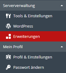 Zunächst wird die Odin Verwaltungsoberfläche aufgerufen (früher Plesk Panel). In der linken Spalte selektiert man „Erweiterungen“.