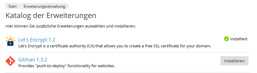 Im Hauptfenster „Katalog der Erweiterungen“ sucht man das Let’s Encrypt Paket und wählt „Installieren“. Im Beispiel unten ist es schon installiert und der Status wird angezeigt.