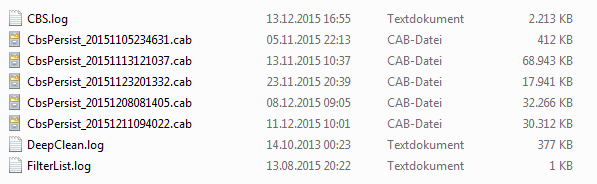 SFC.exe logt alle Reparatur- und Prüfprozesse in das CBS.log, welches ab einer Größe von etwa 50 MB gepackt und in ein CbsPersist_<Date>.cab archiviert wird. Die Dateien liegen unter c:\windows\logs\cbs. Der Screenshot unten zeigt ein normales cbs Verzeichnis auf einem Windows7 System. Die CAB Dateien sind nur wenige MB groß.