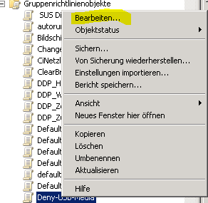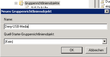 Zunächst erstelle ich eine Gruppenrichtlinie, die den Zugriff auf Wechselmedien unterbindet. Dazu erzeuge ich im Gruppenrichtlinien-Editor ein neues Objekt mit dem Namen „Deny-USB-Media“.