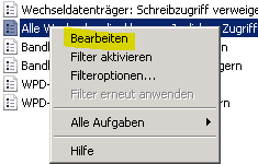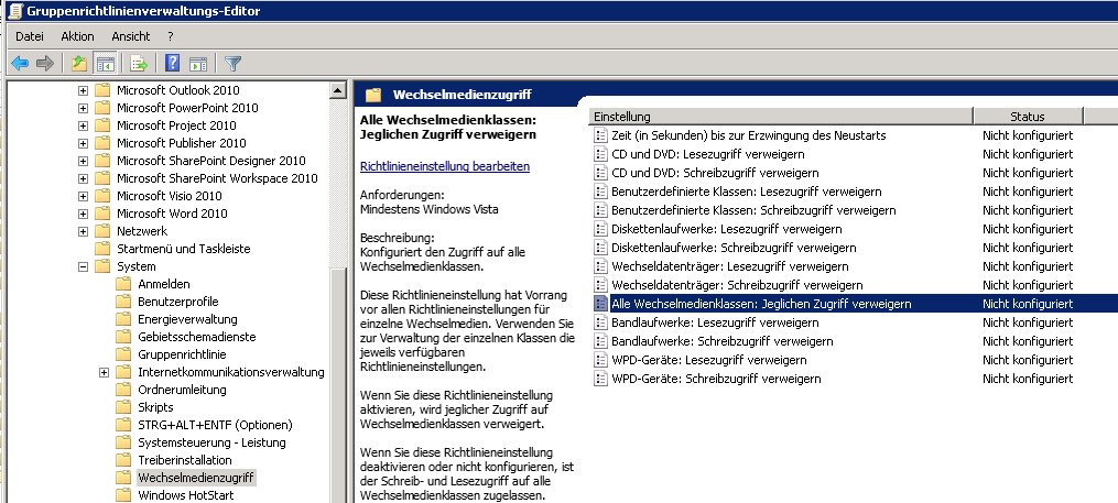 Hier finden sich abgestufte Verbotsrichtlinien für CD und DVD Medien, Bandlaufwerke, Disketten und Wechseldatenträger. Wahlweise kann lesen oder schreiben verboten werden. Je nachdem was man mehr fürchtet. Gefahren, die von außen kommen (Leseverbot), oder Daten die unerlaubt nach extern gebracht werden (Schreibverbot). Im Beispiel unten verbieten wir jeglichen Zugriff auf alle Arten von Wechselmedien.