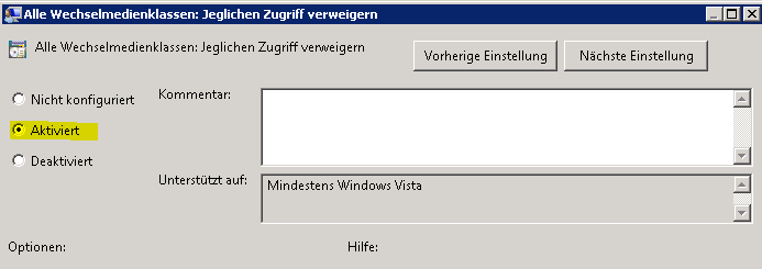 Aktivierung der Richtlinie „Alle Wechselmedienklassen: Jeglichen Zugriff verweigern“