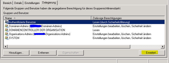 Im Standard gilt die GPO für alle authentifizierte Benutzer. Wichtig bei der Delegierung sind die beiden Parameter „Lesen“ und „Gruppenrichtlinie übernehmen“. Man sollte allen Gruppen Leserechte auf das GP-Objekt erteilen. Das vermeidet unschöne Fehler im Systemprotokoll. Angewendet wird die Regel nur, wenn auch der Haken bei „Gruppenrichtlinie übernehmen“ auf „Zulassen“ gesetzt ist.