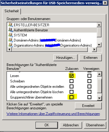 Wie erreicht man nun, daß eine bestimmte Nutzergruppe vom Verbot ausgenommen wird? Dazu muss man verhindern, daß diese Gruppe die GPO übernimmt. Im obigen Dialog fügt man zunächst die gewünschte Gruppe (z.B. Admins) hinzu und setzt den Haken für „Gruppenrichtlinie übernehmen“ auf „Verweigern“. Die Regel gilt zwar für alle authentifizierten Benutzer (Zulassen), aber der Ausnahmegruppe wird die Übernahme der GPO verweigert (=nicht angewendet). Eine Verweigerung wirkt stärker, als eine Erlaubnis.