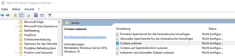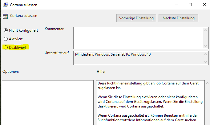 Im Standard ist die Option nicht konfiguriert. Das heisst Cortana ist für die Suche aktiviert. Erst mit Auswahl von „Deaktiviert“, wird Cortana in der Suche abgeschaltet.